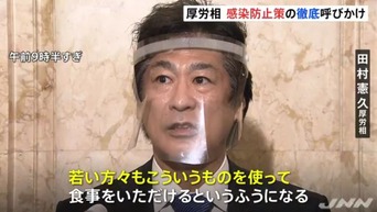 「あまりにも感染拡大してきますと、今度は行動制限をお願いしていかないとならない。こういうフェイスシールドですね、これあります。機能・デザインがいいものがどんどん出てきていただけると、若い方々もこういうものを使って食事をいただけるというふうになる」(田村憲久厚労相)