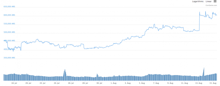アルゼンチンペソ建てで見ると、ビットコイン価格は高止まりしている。