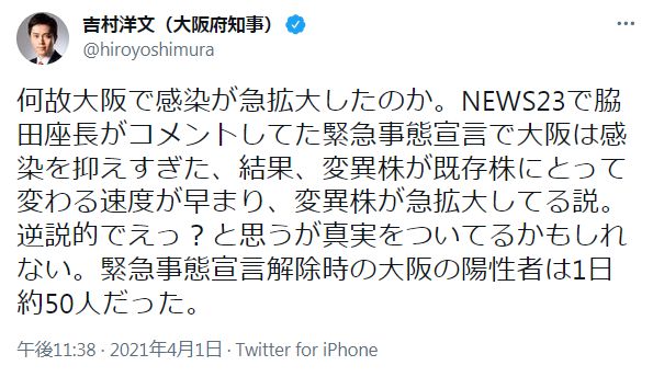 何故大阪で感染が急拡大したのか。NEWS23で脇田座長がコメントしてた緊急事態宣言で大阪は感染を抑えすぎた、結果、変異株が既存株にとって変わる速度が早まり、変異株が急拡大してる説。逆説的でえっ?と思うが真実をついてるかもしれない。緊急事態宣言解除時の大阪の陽性者は1日約50人だった。