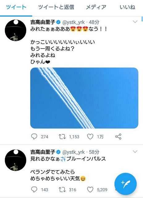 写真は、スモークを出たブルーインパルスの編隊が青空を一直線に飛んでいく姿が写る。吉高は「みれたぁぁあああ」と目がハートになった顔の絵文字を3つ並べて狂喜乱舞し、 「なう!! かっこいいいいいいぃいいい もう一周くるよね? みれるよね ひゃん」と興奮冷めやらぬ様子だった。30分間で8000を超える「いいね」が付き、 フォロワーからは見られたことを祝福する声があがった。