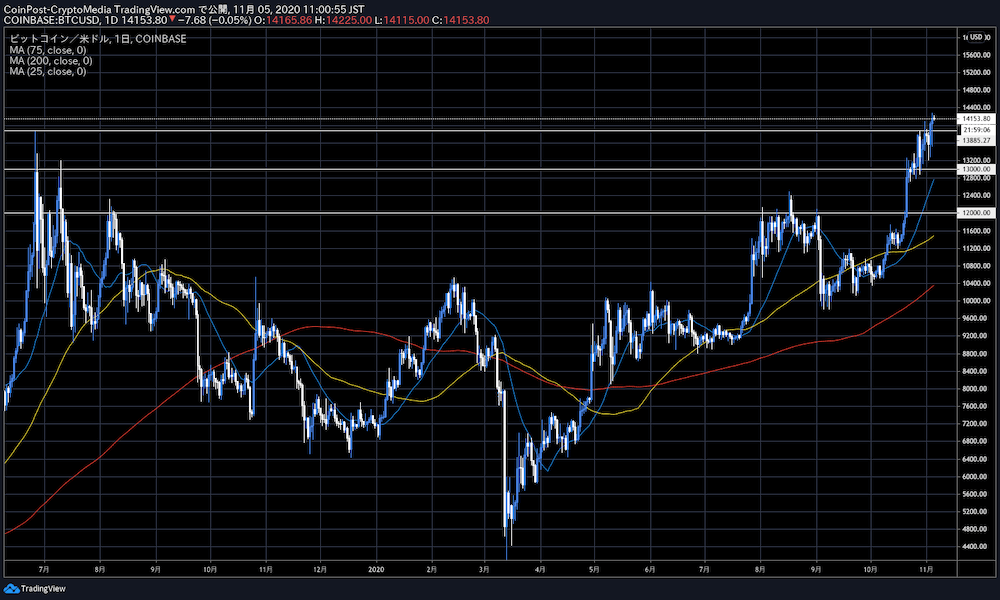 5日の暗号資産(仮想通貨)市場。 ビットコイン(BTC)価格は、前日比+2.07%の148万円(14220ドル)に。14,000ドルを再び回復した。