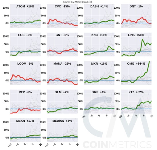 CoinMetricsによると、実際の上場に至った場合、2018年〜2020年に上場が実現した多くの銘柄は上場発表から10日間までの期間で価格が上昇する傾向が見られた。