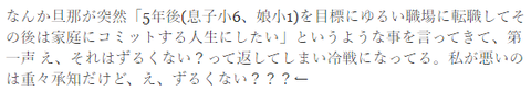 解説すると、今が一番手がかかる時期なので、手がかからなくなってからゆるい仕事に転職して家庭に参加するのはずるくないかという話のようだ。