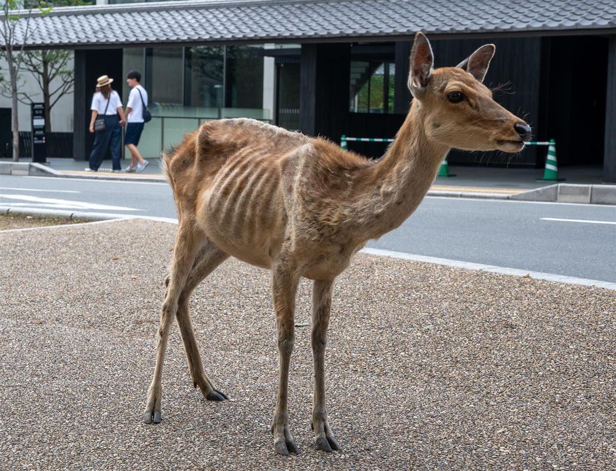 新型コロナウイルスは、奈良市の奈良公園周辺に生息する国の天然記念物「奈良のシカ」の生活にも影響を与えている。観光客が減ったことで公園を離れ、野生に近い健康的な生活を取り戻すシカがいる一方で、「鹿せんべい」への依存から抜け出せず、やせ細るシカもいるようだ。(桑島浩任)奈良市の奈良公園周辺には約1300頭のシカが生息。奈良公園を訪れる観光客は年間1300万人、鹿せんべいの売り上げは約2千万枚に上る。シカの保護施設「鹿苑(ろくえん)」に収容されている約400頭を除く900頭が大部分を消費しており、単純計算で1頭当たり1日60枚以上を食べていることになる。せんべいは1枚3~4グラム程度で、1日約5キロの草を食べるシカにとっては「おやつのようなもの」とされる。だが、栄養価は草よりも高く、販売所の近くにはせんべいを買う観光客を待ち構えるシカでごった返すのが日常だった。ところが、新型コロナの感染拡大以降、観光客は姿を消し、鹿せんべいの売り上げも激減。それに伴い、シカの生活にも変化が生じている。北海道大の立沢史郎助教(保全生態学)と奈良の鹿愛護会が実施した調査で、奈良公園の中心部に滞在するシカの数が減少していることが分かった。感染拡大の前後で比較すると、昼に公園中心部で確認されたシカは1月は全体の71・9%だったのに対し、6月は50・2%に激減。夜は1月が56・5%、6月が34・9%で、いずれも20ポイント以上減少していた。立沢助教は「人から餌をもらう機会が減り、主食の草を探して歩き回ることが増えたのではないか」と指摘する。全文はソース元でhttps://www.sankei.com/images/news/200924/wst2009240001-p1.jpg