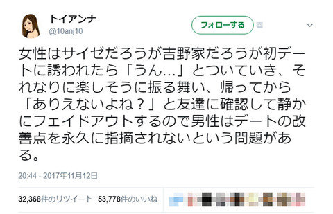「デートでサイゼリヤ」論争再び!トイアンナさん「男性はデートの改善点を永久に指摘されない」ツイートが波紋を広げる以前にある婚活コンサルトによる初ランチデートでイタリアンファミレス『サイゼリヤ』に行く男子が増えたことを嘆くツイートが賛否両論を呼んだことがありました。婚活コンサル始めた頃に女性との初ランチデートは気軽なイタリアンが良いですよってアドバイスしたらサイゼリヤデート男子が大量発生したので、ファミレスはダメですよって言ったらカプリチョーザを判を押したように選び初めてぐぬぬ…ってなったのは苦い思い出。時をおいて、今度は『恋愛障害-どうして「普通」に愛されないのか-』(光文社新書)などの著書があるブロガー・ライターのトイアンナさん(@10anj10)がサイゼリヤや吉野家にデートで連れて行かれた女性の心理をツイートして波紋が広がっています。女性はサイゼだろうが吉野家だろうが初デートに誘われたら「うん…」とついていき、それなりに楽しそうに振る舞い、帰ってから「ありえないよね?」と友達に確認して静かにフェイドアウトするので男性はデートの改善点を永久に指摘されないという問題がある。