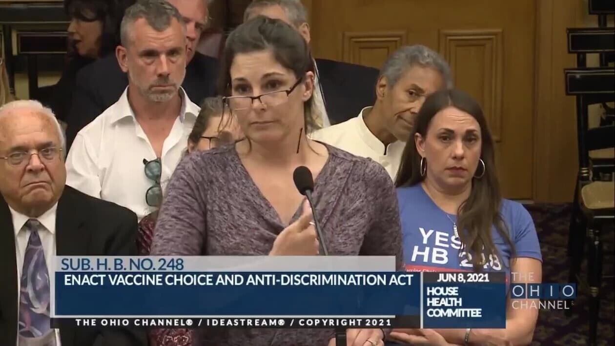 新型コロナウイルスのワクチン接種で体が磁石になったことを証明するため、女性看護師が公聴会の場で実演。
