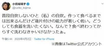 小島はこの日、「普段自炊しないひと(私)の自炊。作って食べるまでは出来るんだけど後片付けの能力が著しく低い。どうしても食器を洗いたくない。なんで?食べ終わってからすぐ洗わなきゃいけなかったぁ」と嘆きのツイート。