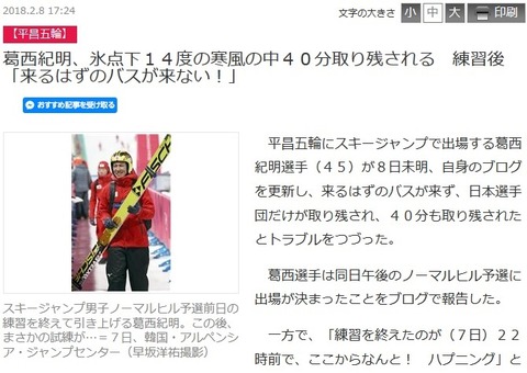 平昌五輪にスキージャンプで出場する葛西紀明選手(45)が8日未明、自身のブログを更新し、来るはずのバスが来ず、日本選手団だけが取り残され、40分も取り残されたとトラブルをつづった。