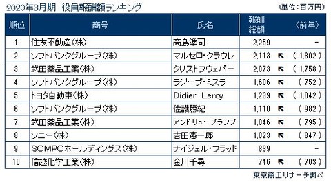 30日までに報酬額1億円以上で開示された480人のうち、最高額は住友不動産の高島準司元会長の22億5,900万円。2位はソフトバンクグループのマルセロ・クラウレ副社長COOの21億1,300万円。3位は武田薬品工業のクリストフウェバー社長の20億7,300万円、4位はソフトバンクグループのラジーブ・ミスラ副社長の16億600万円、5位はトヨタ自動車のDidier Leroy元副社長が12億3,900万円、6位はソフトバンクグループの佐護勝紀副社長CSOの11億1,000万円、7位は武田薬品工業のアンドリュープランプ取締役が10億4,600万円、8位のソニーの吉田憲一郎代表執行役会長兼社長CEOが10億2,300万円と、8人が報酬額10億円以上を受け取った。