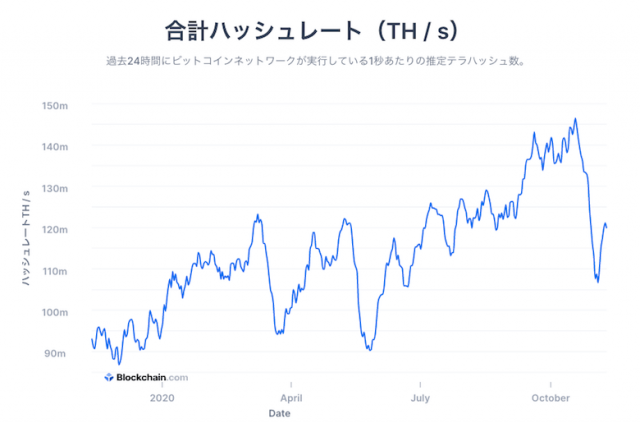 暗号資産(仮想通貨)ビットコインのハッシュレート(採掘速度)が、20年8月水準まで戻りつつある。