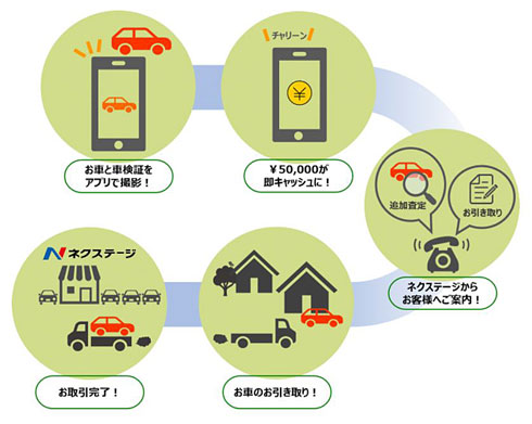 クルマの買い取りは、中古車販売店などを運営するネクステージとの提携で実現した。利用者が売りたいクルマの年式やコンディションを入力後、車検証とクルマを撮影し、「いますぐキャッシュにする」を選択すると、その場でウォレットに5万円が入金される。後日、ネクステージの専門スタッフが訪問し、追加査定とクルマの引き取りを行う。査定金額が5万円を上回ると、引き取り完了後5営業日以内に差額が銀行口座に振り込まれる。