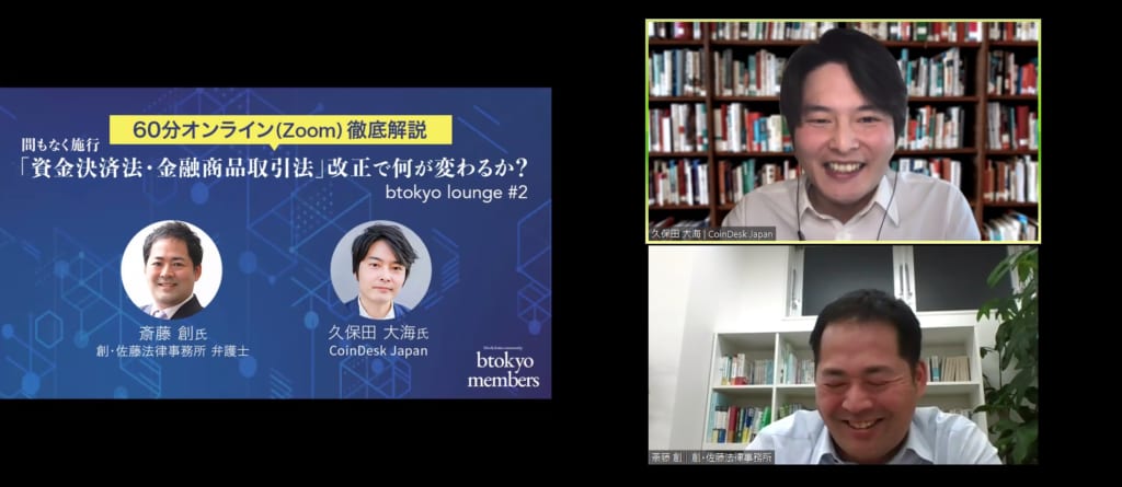 ブロックチェーンのビジネスコミュニティ「btokyo members」による初のオンラインイベント「『資金決済法・金融商品取引法』改正で何が変わるか?」が2020年4月27日、開催。日本STO協会で監事を務めるなど、フィンテック領域を専門にする弁護士の斎藤創氏(創・佐藤法律事務所 代表弁護士)を招き、法改正のポイントの解説や課題などについて議論した。