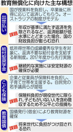 政府は教育無償化の一環として、大学の授業料を国がいったん負担し、卒業後に所得に応じて返済してもらう「出世払い」の導入案の検討を九月から始める。返済が不要な給付型奨学金制度の拡充案とともに、安倍政権が新たな目玉政策に据える「人づくり革命」の具体策の軸となる。制度の設計次第では、卒業後の返済負担が重荷になったり、逆に国の財政悪化に拍車が掛かったりする恐れがあるため、海外の事例も参考にして慎重に議論を進める方針だ。