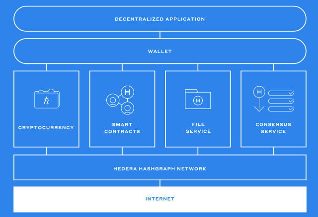 Hedera Hashgraphは、Solidityで記述されたスマートコントラクトをサポートしているため、分散型アプリ(DApps)の開発が可能です。Hedera Hashgraphのアーキテクチャーは、以下の3層で構成されています。