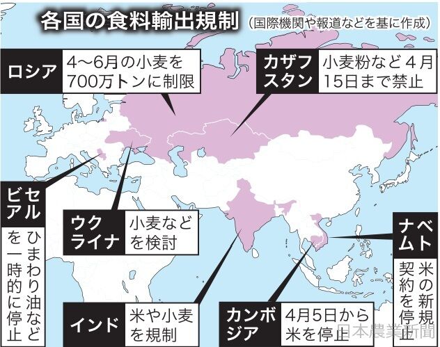 米や小麦、食用油などの基礎的食品の輸出を差し止める動きが出始めたのは3月半ばから。国連食糧農業機関(FAO)が発行するオンライン穀物情報誌MNR最新号の「食料輸出制限情報」によると、ロシアとセルビアが先行し、下旬になってベトナム、カザフスタンなどが追随した。ロイター通信などによると、世界最大の小麦輸出国のロシアは国内供給を優先し、4~6月の穀物輸出量に制限を設けた。通常は無制限だが、上限を700万トン(前年同時期の輸出実績は約720万トン)に設定。既に穀物加工品などは停止し、輸出業者は一層の規制強化を懸念している。