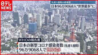 WHOによると、同期間の世界の感染者数は約661万人で、日本が約15%を占めた。米国が約86万人で続き、ドイツ約57万人、イタリア約53万人、フランス約51万人となっている。死者数が最も多かったのは米国の2637人で、日本は272人だった。WHOが管轄する地域別で最も多い「欧州」の感染者数は減少傾向にあり、世界全体でも前週よりわずかに減少した。