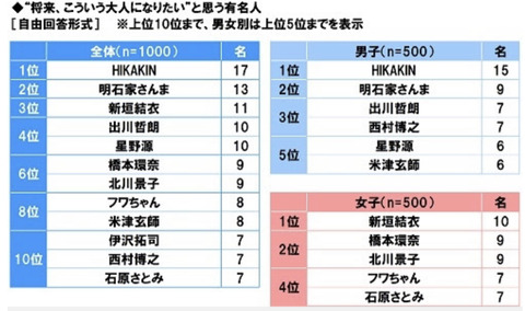 全回答者(中学生200名、高校生800名)に、“将来、こういう大人になりたい”と思う有名人を聞いたところ、1位「HIKAKINさん」、2位「明石家さんまさん」、3位「新垣結衣さん」、4位「出川哲朗さん」「星野源さん」と、“好きなYouTuber”に続きHIKAKINさんが二冠となりました。男女別にみると、男子の回答では1位「HIKAKINさん」、2位「明石家さんまさん」、3位「出川哲朗さん」「西村博之さん」、女子の回答では1位「新垣結衣さん」、2位「橋本環奈さん」「北川景子さん」となりました。選んだ理由を聞いたところ、男子の回答1位のHIKAKINさんについては「自分の好きなことで生きていくスタイルが良いと思ったから」(男子高校生)や「自分の道を選んで生きているから」(男子中学生)、女子の回答1位の新垣結衣さんについては「優しくて、周りのことを楽しませているから」(女子高校生)や「気遣いのできるところが素敵だから」(女子高校生)といった回答がみられました。