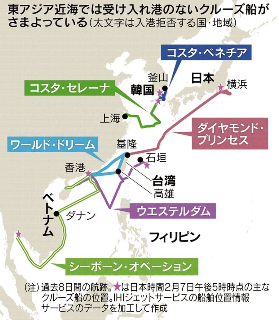 https://i.imgur.com/kvLJZNS.jpg新型肺炎、さまようクルーズ船 入港拒否相次ぐ新型コロナウイルスによる肺炎を巡り、日本や中国周辺を回る大型クルーズ船の運航に支障を来す例が相次いでいる。横浜に到着した船の乗客多数が感染していたことを受け、日本やアジアの国や地域で入港を拒否する動きが広がっているためだ。