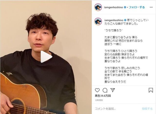 音楽家で俳優の星野源さんが4月3日、自身のInstagramにギターを弾きながら歌う自身の動画を投稿した。