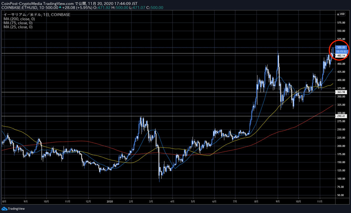 時価総額2位のイーサリアム(ETH)が、今年9月の年初来高値を更新した。500ドル台到達は18年7月以来、2年4ヶ月ぶり。