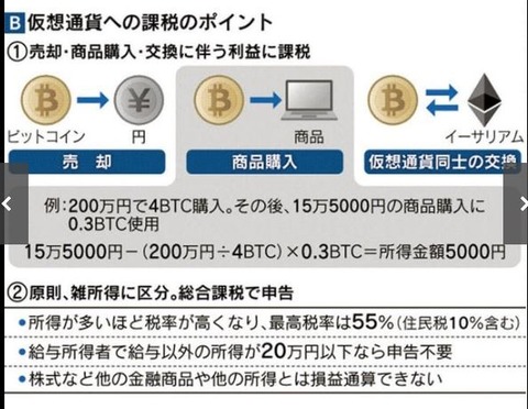 一部投資家が衝撃を受けたのは「ビットコインからイーサリアム」など、仮想通貨同士の交換も課税対象になったこと。頻繁に通貨交換をしていると知らない間に差益が膨らむ可能性がある。新しい種類の仮想通貨を入手する際は交換ではなく新規購入の方が課税リスクを抑えられる。