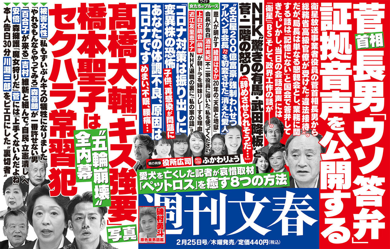 中吊り広告2021年2月18日 発売 / 定価440円(税込)目次より髙橋大輔「キス強要」<写真><“五輪崩壊”全内幕>橋本聖子はセクハラ常習犯▼被害女性「私もずいぶんキスの犠牲になりました」