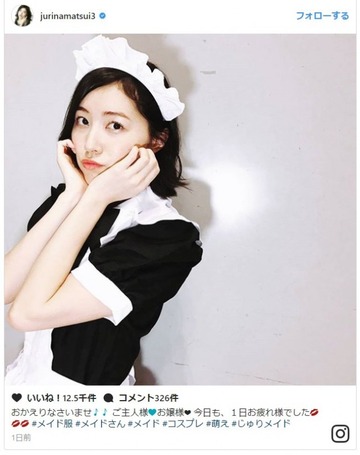 SKE48の松井珠理奈が、18日に自身のインスタグラムを更新し、メイドのコスプレ姿を披露。