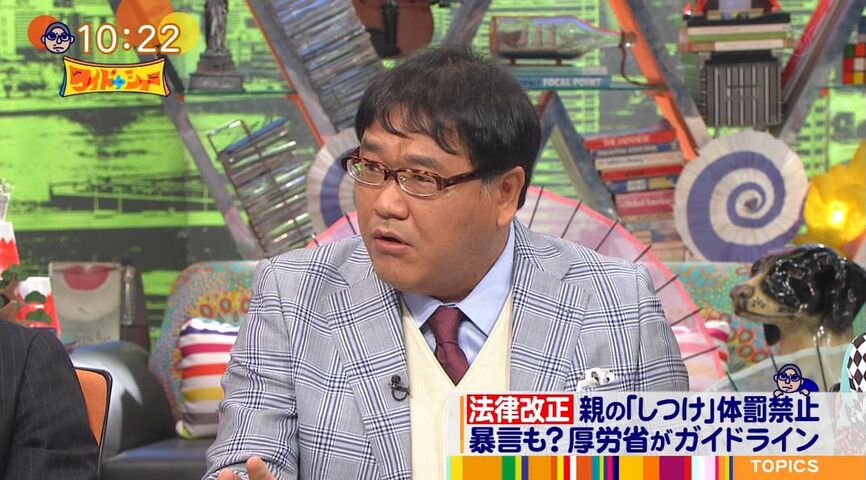 「親の子供に対する体罰…、毎日一緒にいるじゃないですか育ててるし。 これと学校の先生の体罰を一緒にしちゃいけませんよ。 親は自分の責任においてこれは一回怒った方が良いって場面は出てくるんだから。 それを法律でまとめるって、色んな事例がありますからね。決まりではまとめられませんよ。親が怒っても駄目暴言も駄目って、そこは見えない場所でしょ? それが世の中に見えたときと言うのは訴えがあったときで、それは体罰じゃなくて虐待なんですよ! 虐待と親の体罰は別物と考えましょうよ。 虐待事件がおこるのはレアケースなんですよ。」