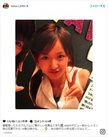 元AKB48メンバーで歌手・タレントの板野友美がAKB48デビュー前の稽古時の14歳頃だという写真をInstagramで公開し、「変わらない!!」「超絶可愛い」などと反響を呼んでいる。