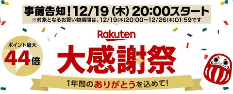 楽天にて12月19日20時00分より「楽天大感謝祭」が開催されます。