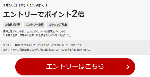 とりあえずエントリーするだけで楽天での買い物が全てポイント2倍だお!(還元上限は1000ポイント)