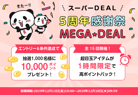 楽天にてスーパーDEAL5周年感謝際の「MEGA DEAL」が開催されます。