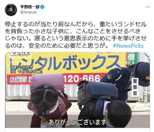 停止するのが当たり前なんだから、重たいランドセルを背負った小さな子供に、こんなことをさせるべきじゃない。渡るという意思表示のために手を挙げさせるのは、安全のために必要だと思うが。 #NewsPicks