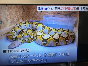 今月6日、横浜市戸塚区のアパートの部屋からペットとして飼育されていた体長およそ3.5メートル、重さおよそ10キロの黄色の「アミメニシキヘビ」が逃げ出しました。