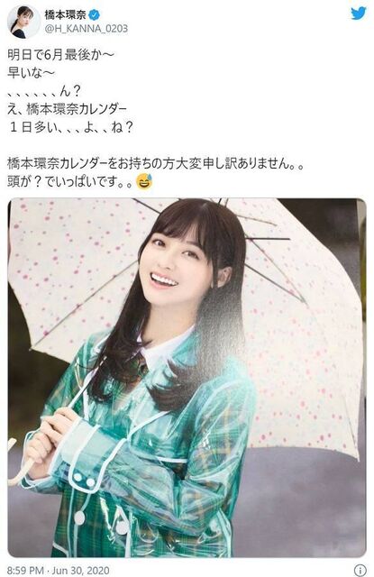 混乱気味のつぶやきに、雨がっぱ姿で傘を差す笑顔の橋本が彩る6月のカレンダーの写真を添付。ばっちり「31」の日付が印字されている。