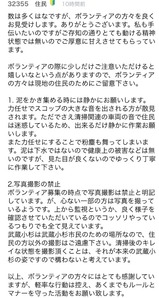 以上、ボランティアの方々にはとても感謝していますが、軽率な行動は控え、あくまでもルールとマナーを守った活動をお願い致します。