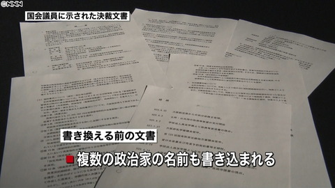 その文書には、森友学園との交渉経緯や「本件の特殊性」といった文言が含まれているほか、複数の政治家の名前も書き込まれているという。