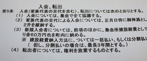 同町が高額な入会費を求める発端となったのは、同年の集会所建て替えだ。建設費は約2千万円で、財源に近隣の下水処理施設整備で払われた県補償金(1戸当たり30万円)と町内各戸の2年間の積立金(同約30万円)を充てた。この時、町内会の内規が改定され「(新規入会者については)集会所建設経費として1戸当たり金60万円を町内に納める」などの文言が盛り込まれた。