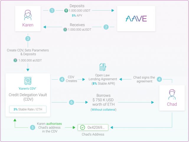 AaveのCEOであるStani Kulechov氏はツイッターでサービスを説明、それによると例えばAさんがテザー(USDT)をAaveに預け、与信枠をBさんに委任すると、Bさんはイーサリアム(ETH)などをAaveから引き出すことができる。