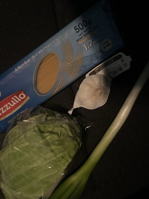 パスタ270円~280円、キャベツ90円~100円、ネギ100円前後、にんにくが中国かスペインなら100円前後。