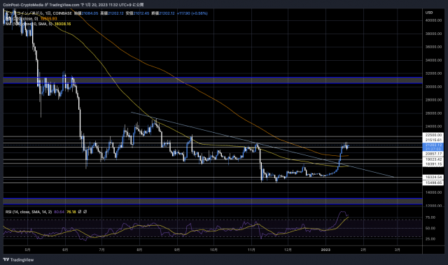 暗号資産(仮想通貨)市場では、ビットコインは前日比2.00%高の21,175ドル。