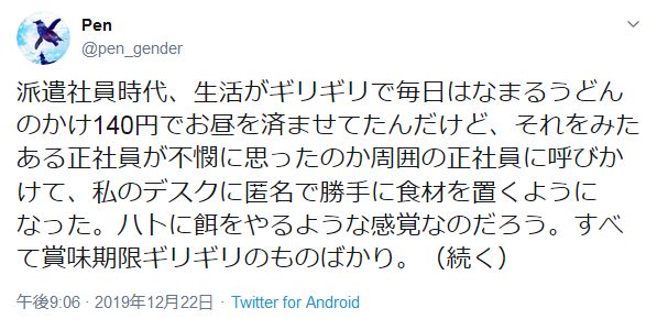 派遣社員時代、生活がギリギリで毎日はなまるうどんのかけ140円でお昼を済ませてたんだけど、それをみたある正社員が不憫に思ったのか周囲の正社員に呼びかけて、私のデスクに匿名で勝手に食材を置くようになった。ハトに餌をやるような感覚なのだろう。すべて賞味期限ギリギリのものばかり。(続く)