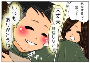 そのまま寝てしまったthunthunさん。彼氏に声をかけられて声で目を覚ますと、視界に飛び込んできたのは、干された洗濯物やおいしそうな食事、ピカピカのお部屋! 優しい笑顔で「大丈夫 無理しないで いつもありがとうね」と抱きしめる彼氏に、thunthunさんは感謝とごめんなさいの気持ちを伝え、心の中で彼のお母さんに彼を生んでくれてありがとうとさらに感謝するのでした。