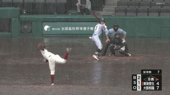 すでに4日間順延しているため、日程に余裕がない今大会。小雨が降る中で始まった試合は大阪桐蔭が3本塁打などで終始リードを奪ったが、5回以降、雨が強くなるにつれて水が浮いたグラウンドでゴロの打球が止まったり、打者のバットがすっぽ抜けたりとアクシデントが頻発。審判が足を滑らせる場面もあった。