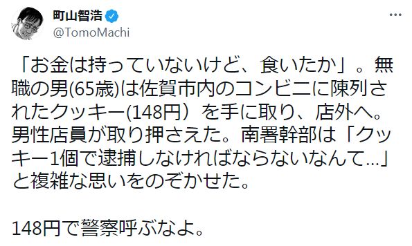「お金は持っていないけど、食いたか」。無職の男(65歳)は佐賀市内のコンビニに陳列されたクッキー(148円)を手に取り、店外へ。男性店員が取り押さえた。南署幹部は「クッキー1個で逮捕しなければならないなんて…」と複雑な思いをのぞかせた。