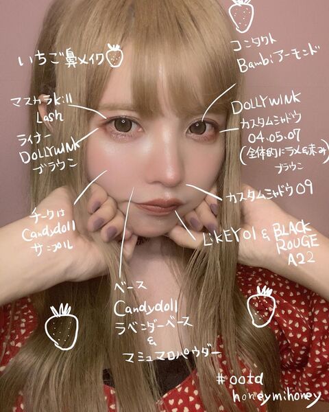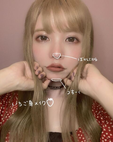 中国で流行している鼻の頭を赤くする「いちご鼻メイク」が気になっていたという益若は、「「可愛いけど、、いや、、メイクしてる女の子の写真がたまたま可愛いだけで、現実世界ではやらないだろう」そう思っていた半年後。私は今、いちご鼻メイクにハマっている」と、いちご鼻メイクを施した写真を投稿した。その際、使用したメイク用品を紹介しつつ、メイクのポイントを写真で解説した。