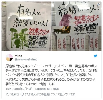 ポスターは、JR原宿駅に貼られたもの。AKBグループや坂道シリーズを手がける秋元康氏が、新たにガールズバンドをプロデュースするという内容だ。