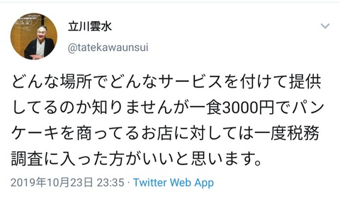 どんな場所でどんなサービスを付けて提供してるのか知りませんが一食3000円でパンケーキを商ってるお店に対しては一度税務調査に入った方がいいと思います。