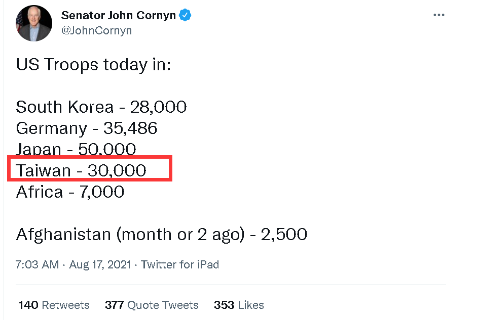 参考ソース:米議員「台湾に米軍3万人駐留」と投稿後に削除、中国メディアは酷評