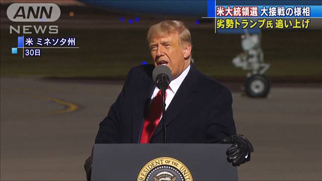 4日後に迫ったアメリカの大統領選挙は大接戦となっていて、トランプ大統領は白人警察官が黒人男性を射殺する事件が起きた激戦州のミネソタ州で国民の安全を守るとアピールしました。トランプ大統領:「11月3日の投票日は共に歴史を作ろう。ミネソタにもきっと特別な日になる」トランプ大統領は「民主党は警察予算を削減し、皆さんの銃を奪おうとしている」とバイデン氏を批判し、国民の安全を守れるのは自分だと主張しました。激戦州のミネソタ州は5月に白人警察官が黒人男性を射殺する事件が起きた場所で、前回、トランプ大統領が敗れた州ですが、最近の世論調査ではバイデン候補に対して4.7ポイント差まで追い上げています。一方、民主党のバイデン候補は前回、民主党が敗れた中西部の激戦州のアイオワ州などを重点に演説を行い、「トランプは国民を見下す金持ちだ」と強く批判するなど、トランプ大統領とのデッドヒートを繰り広げています。